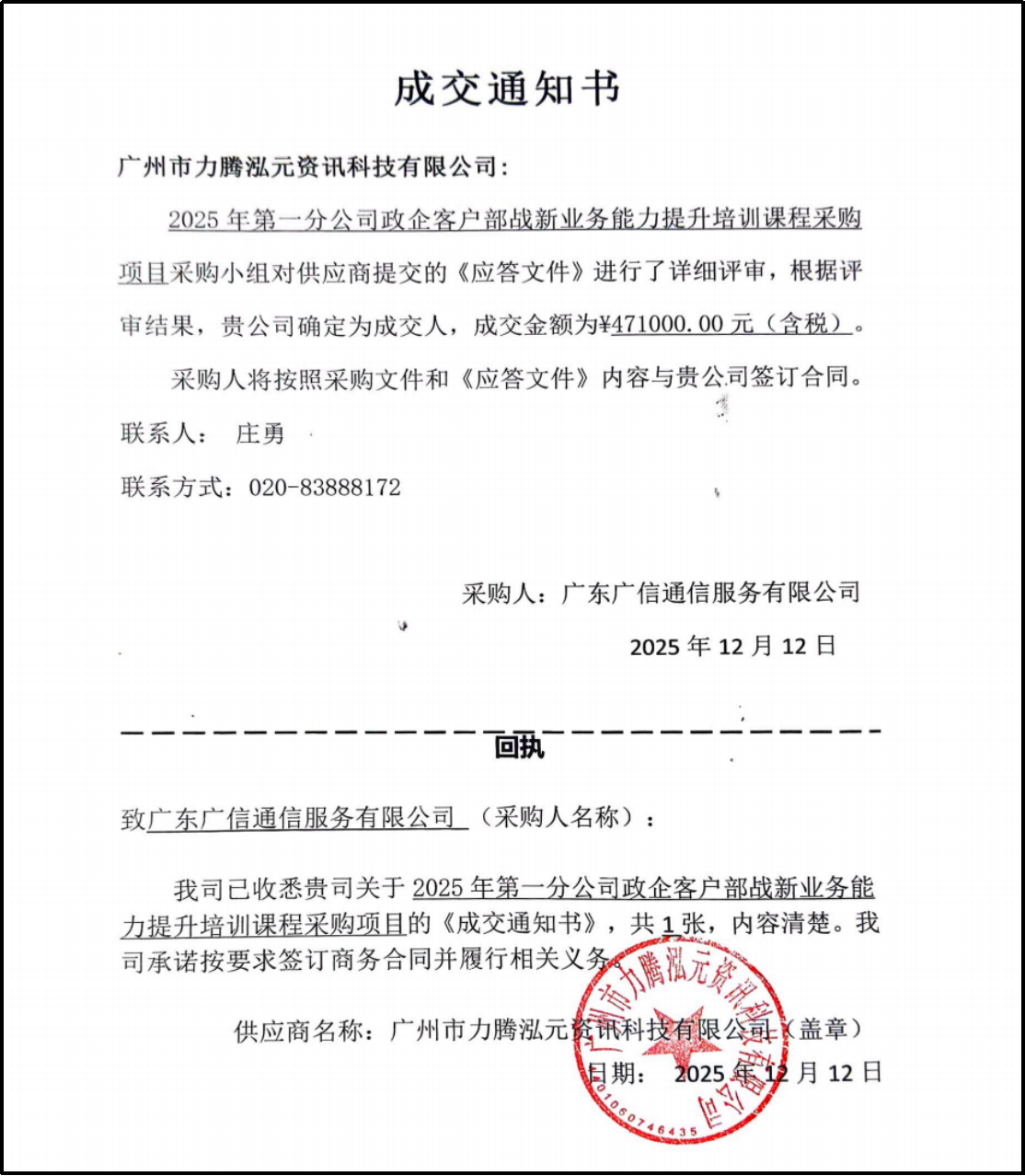 这份成交通知书,是鼓励,更是新征程的起点。我们将以此为契,与客户紧密协作,以优质的培训服务助力能力提升,共同为战新业务的发展注入强劲动力。未来,我们将继续砥砺前行,以专业和诚意,携手客户共创卓越!
